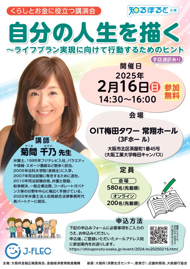 昨年度は3回を予定しており、最終回となる2月16日は元フジテレビアナウンサーで弁護士の菊間千乃さんを講師に招き、OIT 梅田タワー常翔ホール(大阪市北区茶屋町1番45号3階ホール)で「自分の人生を描く~ライフプラン実現に向けて行動するためのヒント」と題した講演会を開催する。参加無料。