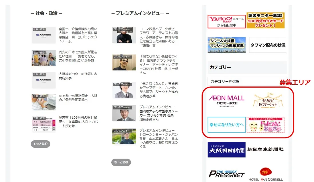週刊大阪日日新聞は紙媒体と同時にホームページ上からも地域の皆さんの生活に密着した情報を発信しています。 バナー広告は、御社の指定したサイトにユーザーを誘導します。ビジネスチャンス拡大のため、週刊大阪日日新聞ホームページを広告メディアとしてご活用くださるよう、ご案内いたします。
