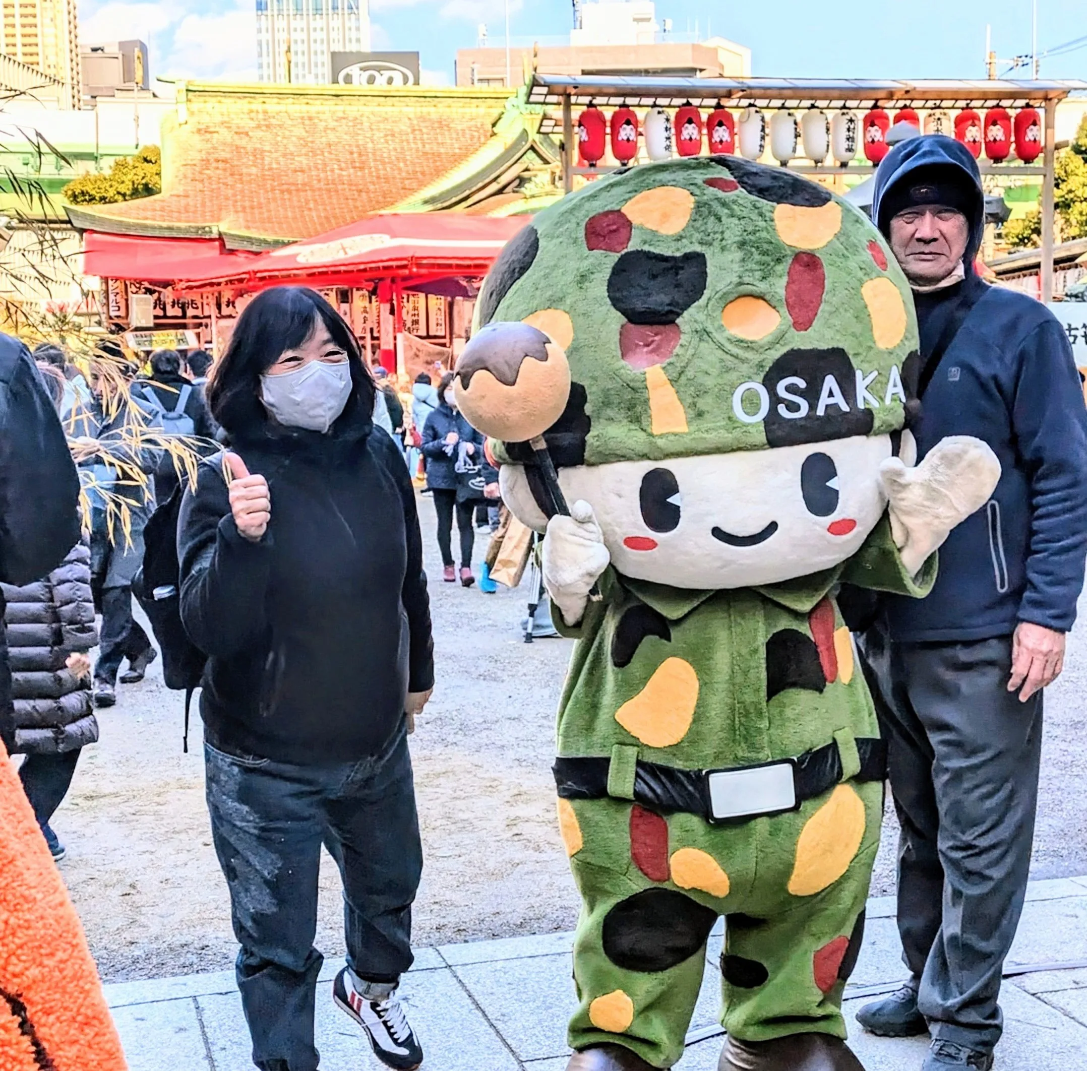 境内で手を振ったり、写真撮影に応じたりしていた「まもるくん」に参拝者も大喜び。仲間と笑顔でスマホのカメラを向ける海外のグループも見られた。