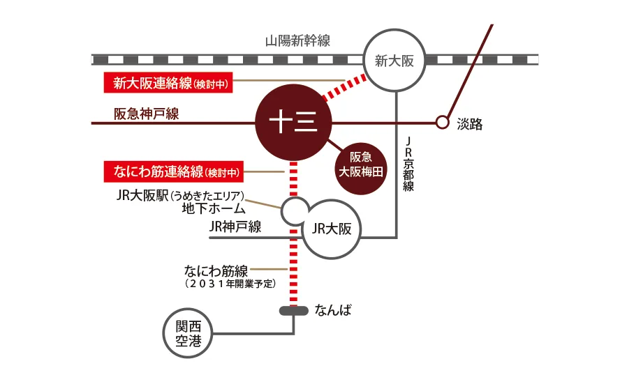 さらに、JR新大阪駅ー十三駅間や、十三駅ーJR大阪駅間の地下ホームを結ぶ阪急の新線構想も検討されている。阪急は、なにわ筋線を経由し、関西国際空港まで乗り入れる方針を打ち出しており、近い将来、十三の交通アクセスはさらに便利になる見通しだ。