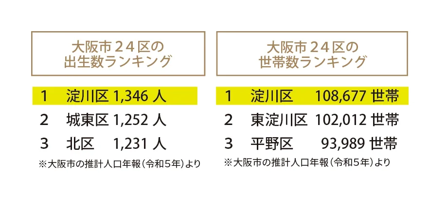 淀川区の人口構成は20~40代が多く、「若くて活気のある街」と言える。同区で出生した新生児は1346人(市内24区中最多)、15歳未満の人口は1万7380人(同3位)と出生~就学期の児童数が多いことが特徴だ。