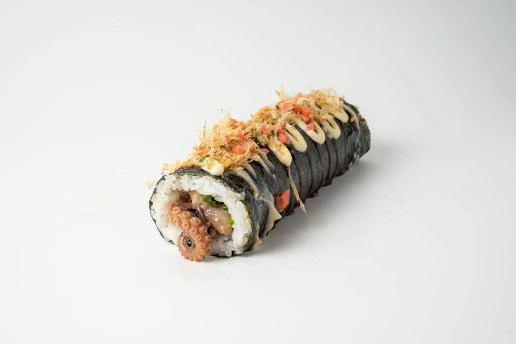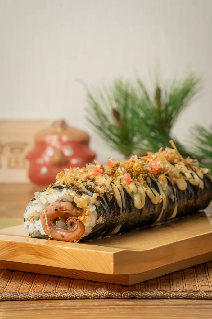 「ひと口いなり むろや」をはじめとする飲食事業を複数展開する「よつばしフーズ」(大阪市西区)が開発した、大阪名物「たこ焼き」と恵方巻きを掛け合わせた「大阪!多幸(タコ)巻」(税込2,000円)だ。