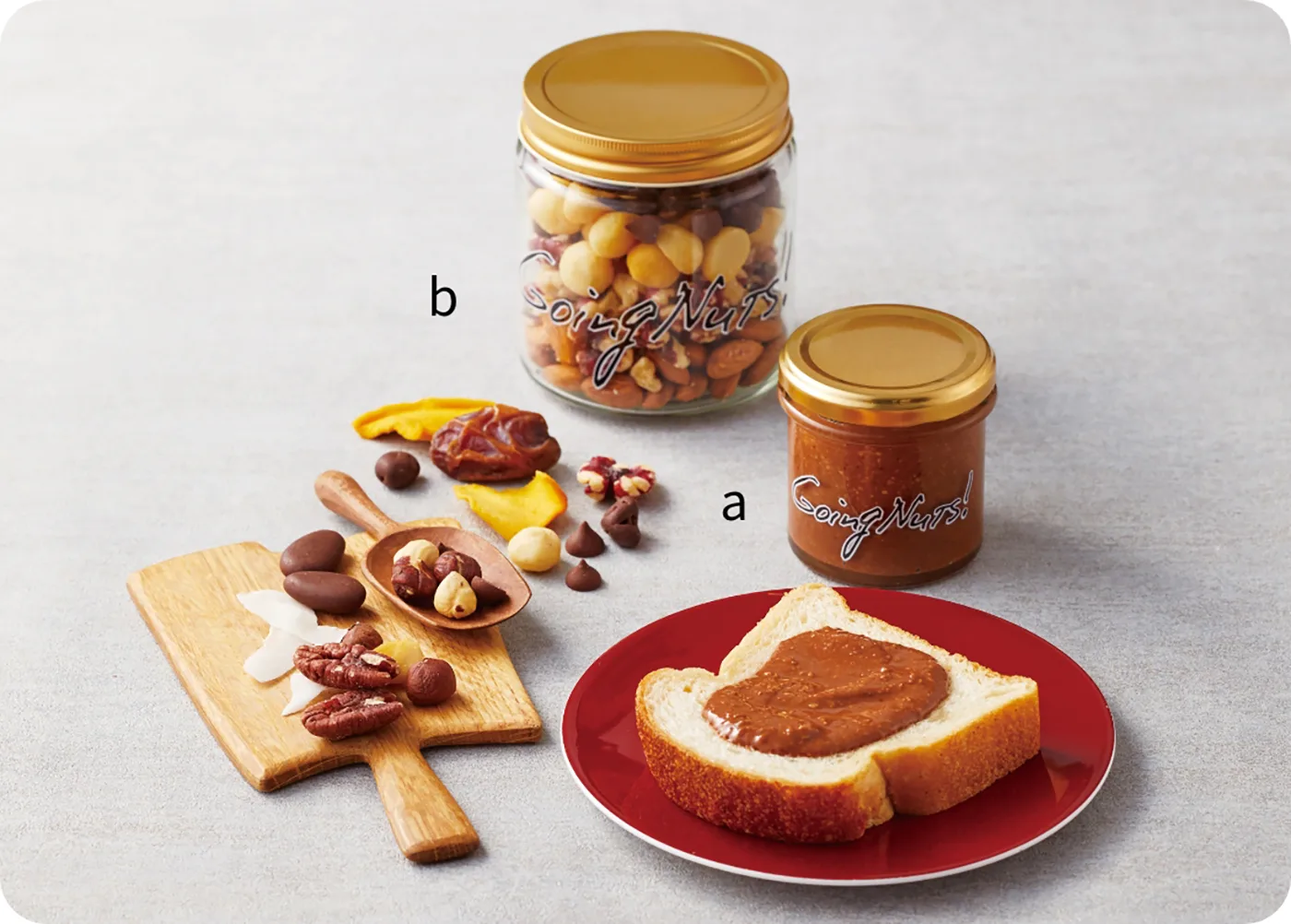 滋賀・近江八幡から初登場。「Going-Nuts」a.「ヘーゼルナッツ ショコラペースト」(100g)税込2200円、b.「こだわりナッツとドライフルーツ」(詰め放題)税込2500円.webp)