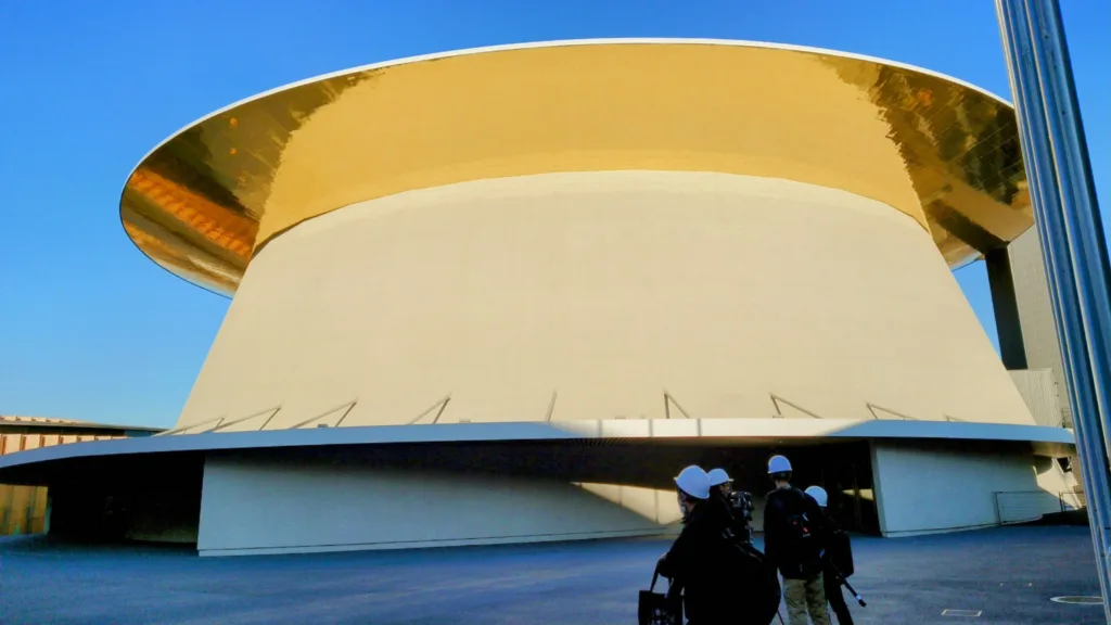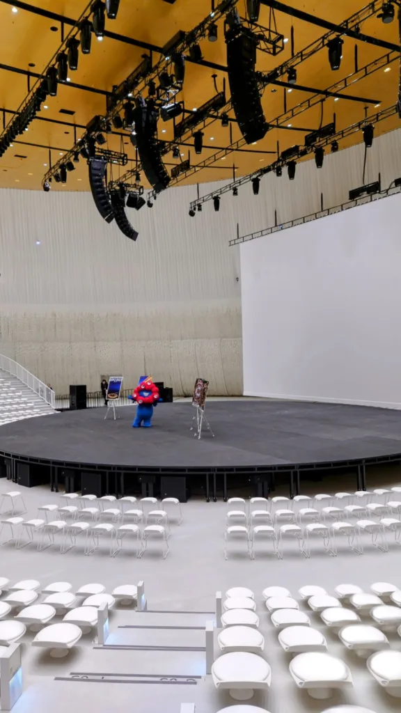 ホールは大阪メトロ夢洲駅を降りすぐの万博会場東ゲートからも近く、黄色の壁に金色のつばを持つ帽子風。1970年大阪万博の「太陽の塔」に匹敵するシンボルとして機能する延べ8400平方㍍の円形劇場で室内は純白の布地で包まれ客席は階段状に計1900。舞台となる円形ステージは直径18㍍あり会期中のさまざまなイベントに対応できる。ステージ上の天井は15㍍と高く、すべての客席から視界をさえぎられずステージを鑑賞できる。