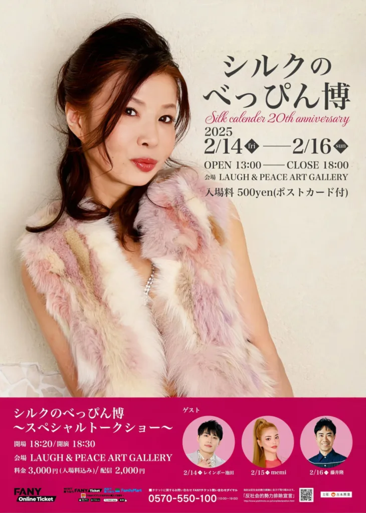 トークではこれまで「美容隊長」を名乗っていた池田と、互いのメイクポーチを見せ合い中の器具やクリームを取り出して実演するなど和気あいあい。終盤でシルクが「私、25年〝美容番長〟を名乗ってきたんですけど、このたび〝美容将軍〟に格上げしましたんで、あなたに継いで頂きたい」と池田に水を向け、自費で20年間製作してきたポスターサイズのセクシーカレンダー制作も「2025年版でいったん休憩します」と休止を宣言。これに対して池田は「美番と美将ですか? シルクさんのお陰で僕も美容への目覚めがあったので、男性として振り切った美を継承したい」と受諾し、自費カレンダー制作活動も「新番長の僕がこれも継承してもいいですか?」と返し、シルクを再び感激させた。