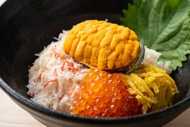 かにみそを混ぜ込んだ秘伝のご飯に、うに貝焼きとカニのほぐし身、イクラをトッピングした限定メニュー。「うに貝焼き」は大粒の貝殻に、うにを山盛りで盛り付け、蒸し焼きにした福島・いわき地方の郷土料理。火を通すことで、よりうにの甘みが増加するという。