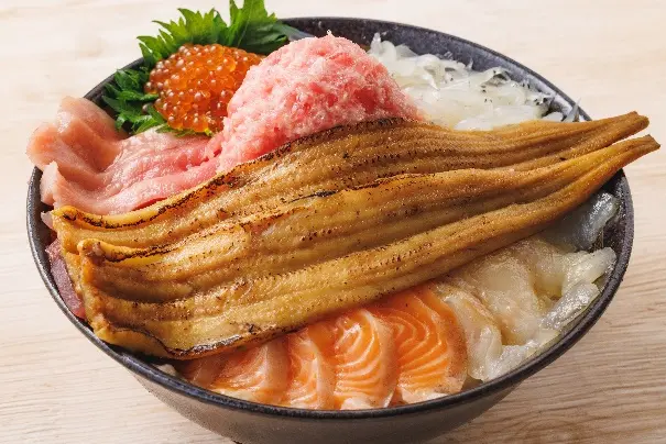 「常磐もの」の代表格のヒラメ、アナゴ、生シラウオ、マグロの切り落としとネギトロ、メイプルサーモン、イクラの7種をてんこ盛り。普通盛りとネタが2倍のメガ盛りを用意。