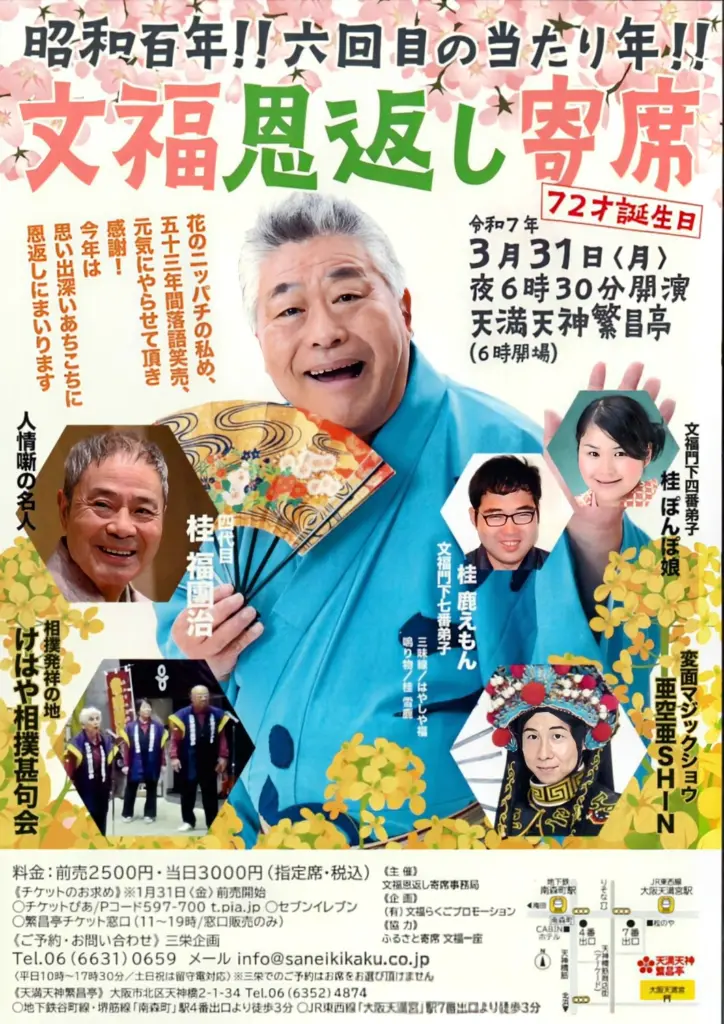 入門53年目を迎え、弟子と孫弟子計9人で一門を形成する上方落語家、桂文福が3月31日自身の72回目の誕生日に「昭和百年!! 六回目の当たり年!! 文福恩返し寄席」と銘打って上方落語協会の本拠地、天満天神繁昌亭で落語界を開く。