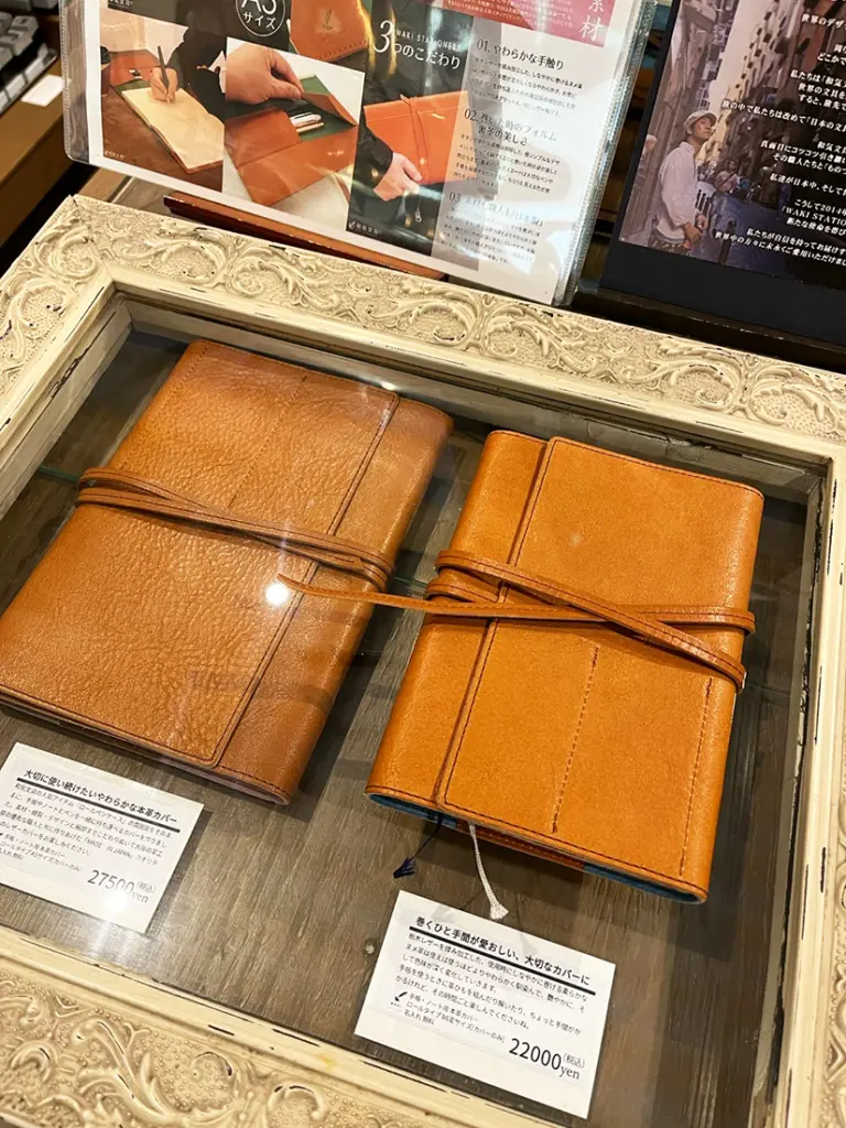 和気文具は大阪の新橋筋商店街に店を構える。創業年と同じ、1926年製のアンティークドアを押して入ると「MADE  IN JAPAN」と記された艶やかな本革カバーが出迎えてくれた。書体を選び、名前を彫刻してもらえるという。
