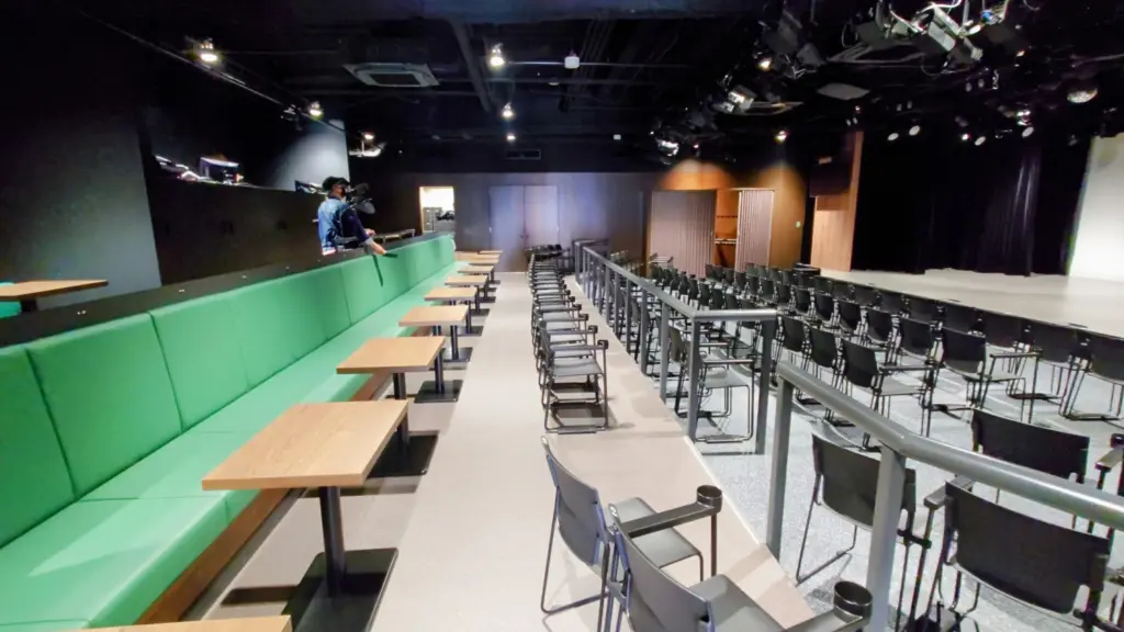 2、3階は大阪名物の串カツやお好み焼きなどが食べられる店舗約20店がずらり。4階はインバウンド客対応も可能なカラオケ店。5階は雅楽や能の公演を仮想体験できる「XRシアター」や終夜営業のライブ型ナイトクラブ。最上階6階はノンバーバル(言語不要)なお笑いライブなどを飲食しながら常時楽しめる吉本興業直営のレストランシアターとなっている。