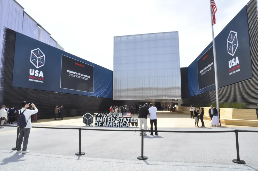 巨大キューブを挟む2面のLEDスクリーンが目印のアメリカ館。内部は5つのエリアに分けられており、アメリカ旅行や宇宙探索などが疑似体験できる。