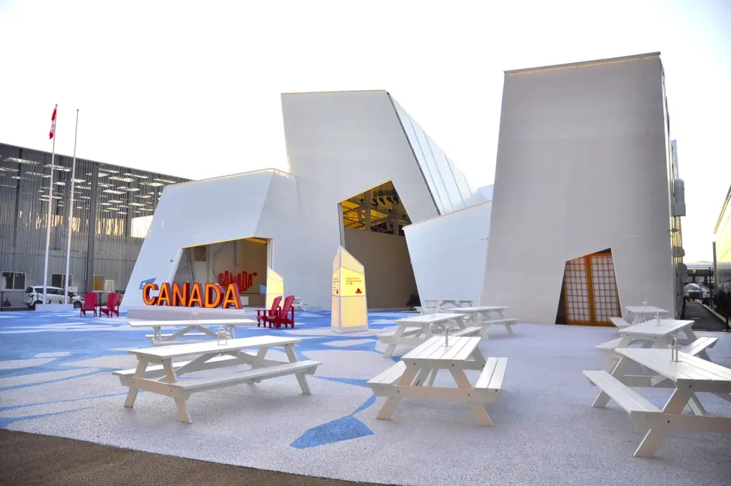 パビリオン正面は幅27メートル×高さ10メートルの大型LEDディスプレイ