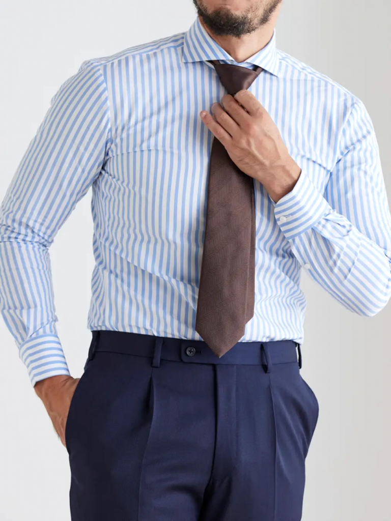 新シャツは、タイドアップ時の〝締め付け感〟を抑えた立体的な襟構造。体型に合わせて腕まわりやウエスト、アームホールのフィット感を自在に調整でき、スマートなシルエットと快適な着心地を両立する。既製シャツにはないオーダーメイドならではの品質が味わえるという。