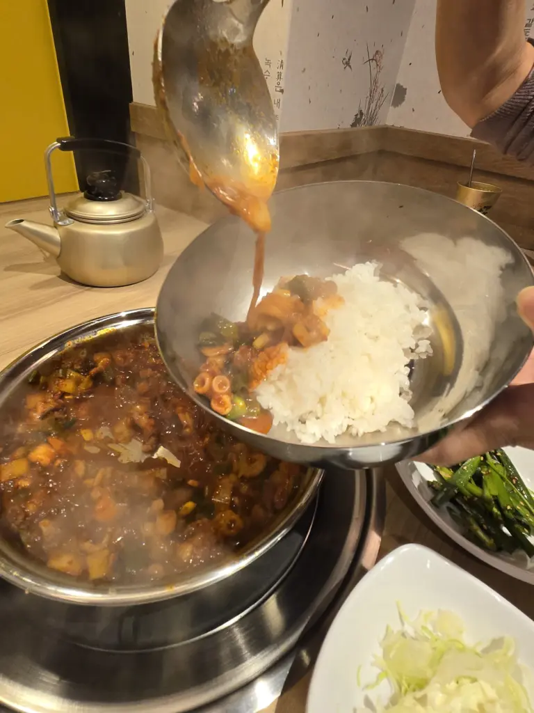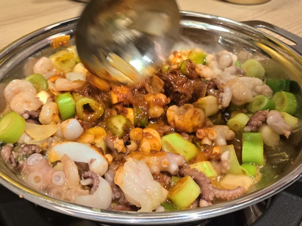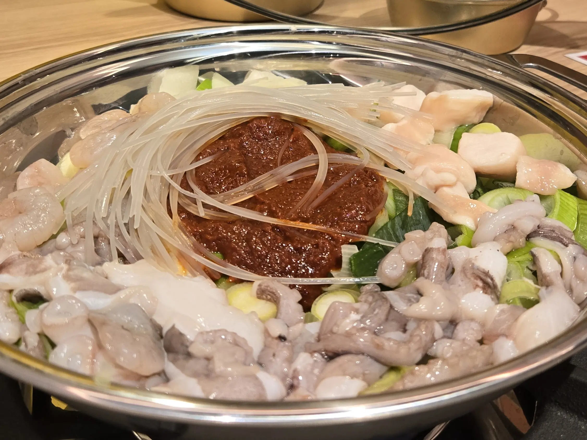 看板メニューは釜山の郷土料理「ナッコプセ」(2,280円〜)。鮮度抜群のテナガダコ、エビ、ホルモンを芳醇な旨味と甘辛さが特徴のピリ辛ソースで炒める鍋料理だ。スタッフに勧められるがまま、炒め上がった熱々の具材をご飯にのせて食べると、食材の歯ごたえとピリ辛がご飯と相性が良く、箸が止まらない。「韓国料理と言えば」の本格生マッコリ(カップ550円)との相性も良く、酒も進む、進む。