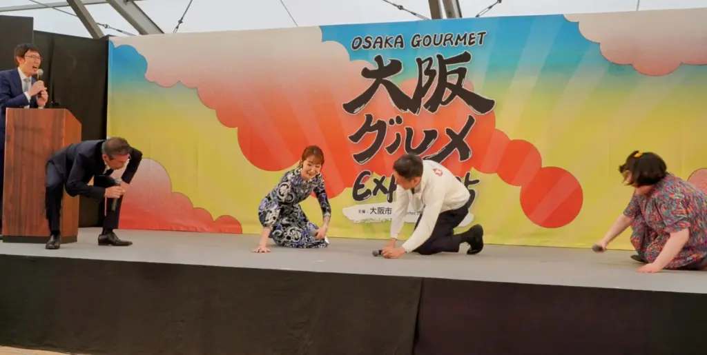 吉本新喜劇の間寛平GMと酒井藍座長は「グルメを楽しみながら舞台を見て頂く新形式。新喜劇では花月うどん店が定番やけど、本物のうどんを小道具に使う手もあるなぁ」と早くもアイデアが続々。ゲストとして登場した元宝塚歌劇団男役トップスターの俳優、紅ゆずるは「私はよく食べる方なので味の組み合わせを楽しみたい」と話した後、「ぜひやってみたかった」という〝新喜劇ずっこけ〟を寛平GMのギャグと共に他の登壇者と一緒に転び大喜び。