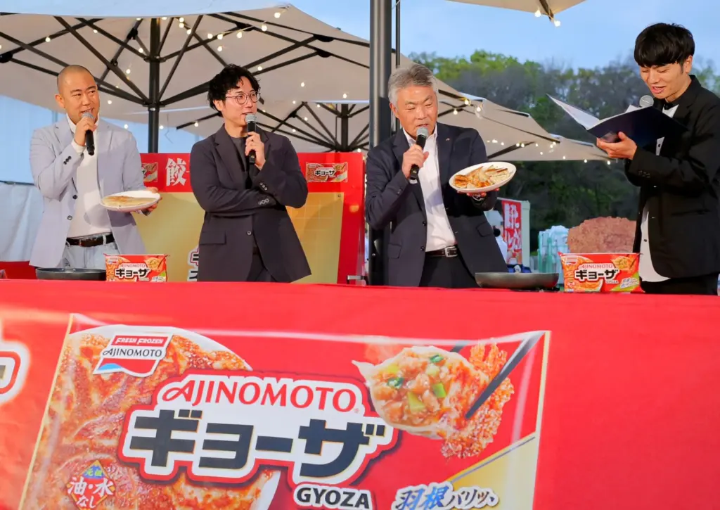夜に入ってギョーザステーションでは運営の味の素冷食・寺本博之社長がコロコロチキチキペッパーズを相手に、同社の代名詞ともなっている羽根付きギョーザを紹介。UTAGEステージでは吉本新喜劇の実演、MATSURIステージではもりやすバンバンビガロがジャグリングを披露し会場を盛り上げた。