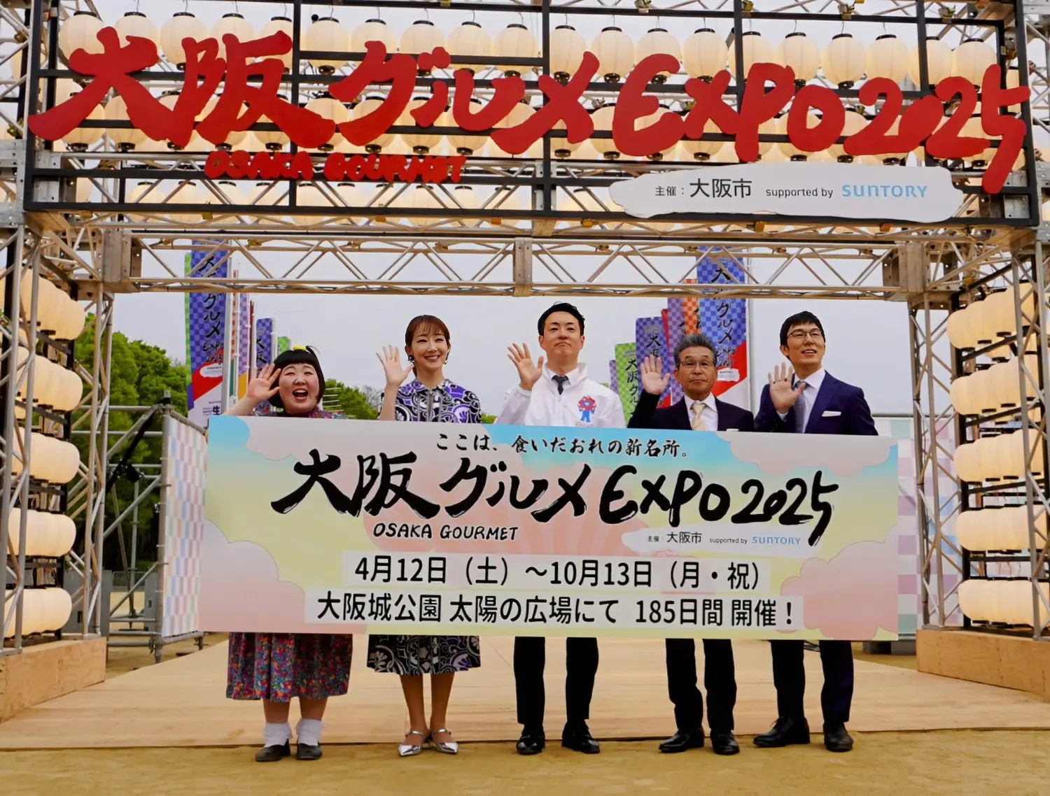 大阪・関西万博開会式に合わせ4月12日から大阪城公園太陽の広場(JR大阪環状線・大阪城公園駅から徒歩2分)で「大阪グルメEXPO2025」がオープンする。万博と同じ10月13日までの半年間設置で大阪市が主催。プレオープンの特別内覧会では招待客約800人が訪れ、軒を並べた30店の飲食店で注文したフーズを2か所の飲食テントなどで味わった。