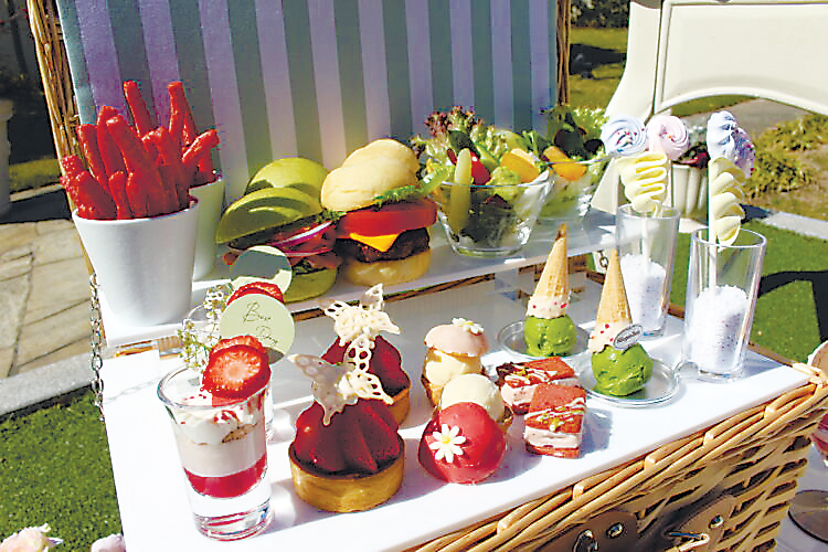 同施設のガーデンには敷物が敷かれ、木箱やクッション、花が彩りを添える中、まるで本物のピクニックのようなスタイルでアフタヌーンティーを楽しめる。旬のイチゴとハーゲンダッツのアイスクリームをぜいたくに使ったスイーツは、見た目もかわいらしく、まるでウエディングの一場面のよう。