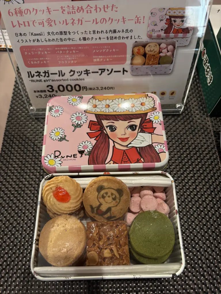 さらに、お土産にも注目。レトロなデザインのクッキー缶で、日本の〝Kawaii〟文化の原型をつくったといわれる内藤ルネ氏のイラストをパッケージに使用。6種のクッキーの詰め合わせで3240円で販売している。