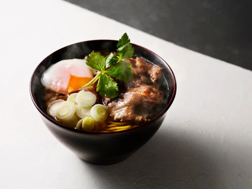 伝統の和風だしに、ホタテやハマグリの旨(うま)味を凝縮。麺は、その風味や食感を最大限に引き出せるように調整された生めんを使用し、注文ごとに茹(ゆ)で上げる。そしてトッピングには、世界に誇る和牛ブランド・神戸牛を贅沢に使用。この組み合わせには、ただの高級感を演出するためではない。「食を通じて被災地・能登を支援したい」そんな思いが一杯のえきそばに込められているのだ。