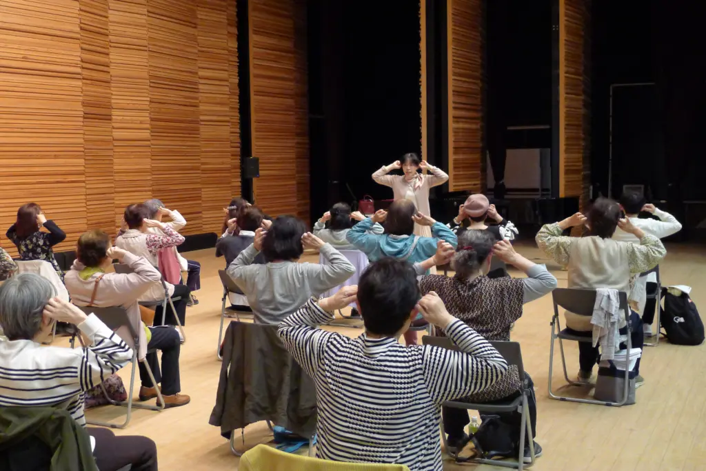 講座は、まず耳を縦に折ったり引っ張ったりして柔らかくし、血流を促す体操からスタート。続いて椅子に座ったまま体を動かしながらハミングし、クイズを交えつつ、横隔膜を使った呼吸法や発声法を学ぶ。ストレッチによって体幹や筋肉がほぐれ、高音が出しやすくなり、音程も安定してくるという。右脳と左脳の活性化にもつながり、歌の上達と健康づくりを同時に目指せる内容だ。後半には「さくらさくら」などの唱歌や、懐かしの曲を全員で合唱。音響に優れたコンサートホールの効果も相まって、参加者の歌声が一段と映える。