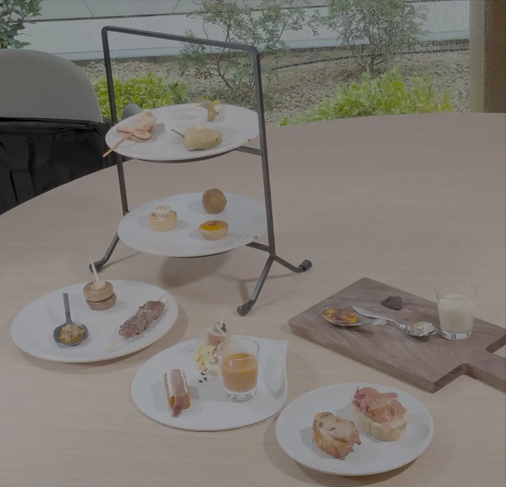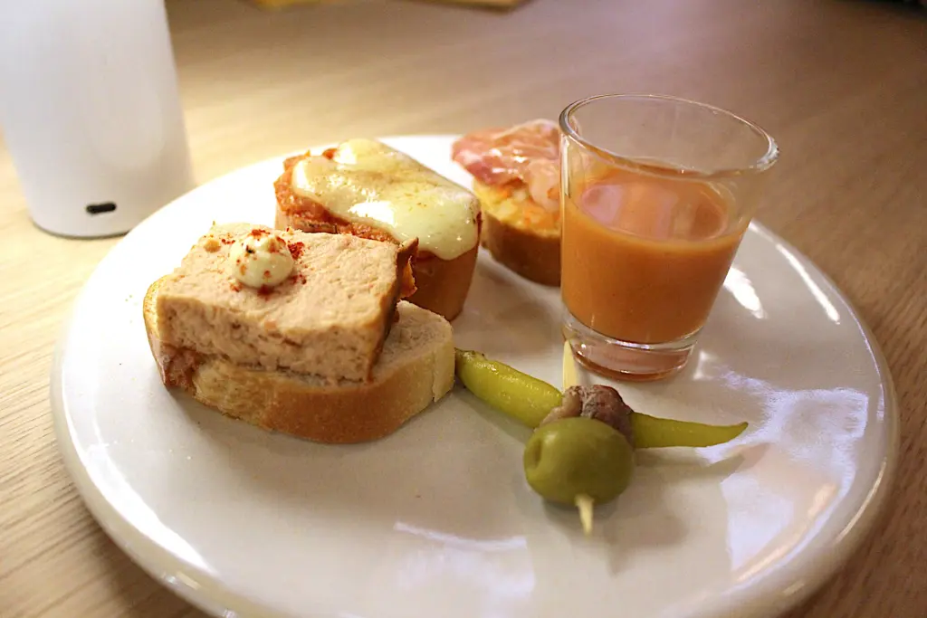ヒルダ(バスク州)やガスパチョ(アンダルシア州)、マドリッド風もつ煮込み(マドリード州)、クレマカタラーナ(カタルーニャ州)、オルチャータ(バレンシア州)など各州を代表する一品ばかり。試食ではヒルダとガスパチョなど5種類を一皿で提供頂いたが、タパスコースは、各3種類ずつ皿に盛られて順番に出てくるとのこと。