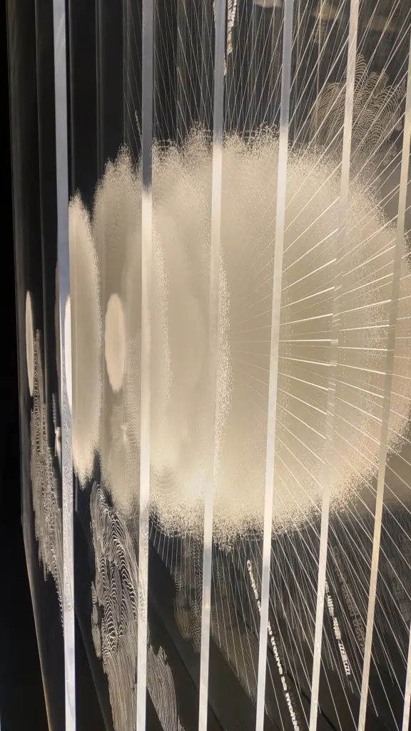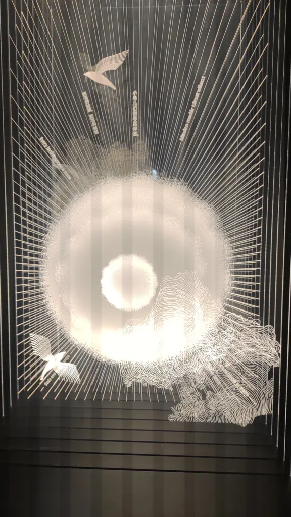 ハンガリーの森や自然を想起させるようなデザインの外観から目を惹く存在。館内に入ると、少し照明を落とした空間に切り絵のようなものがガラスケースの中に展示されている。しかし、この作品、横から見るとその仕掛けがよくわかる。実はガラスを何枚も重ねていて、その1枚1枚に切り絵のようなデザインが固定されているのだ。1枚1枚を合わせて前方から見ると見事な作品になっている。