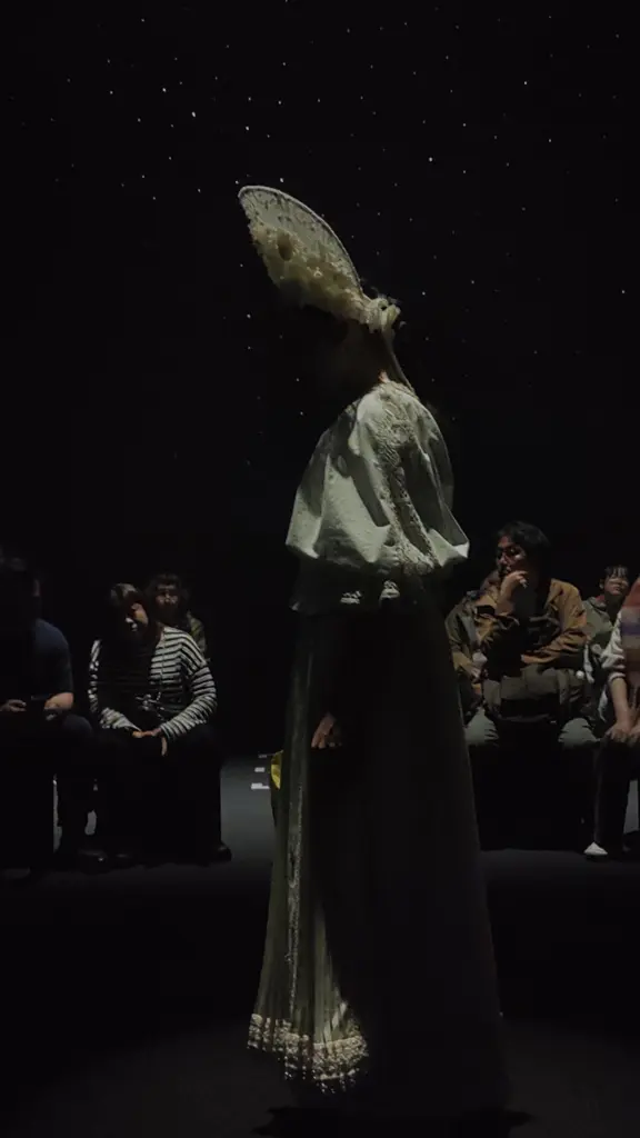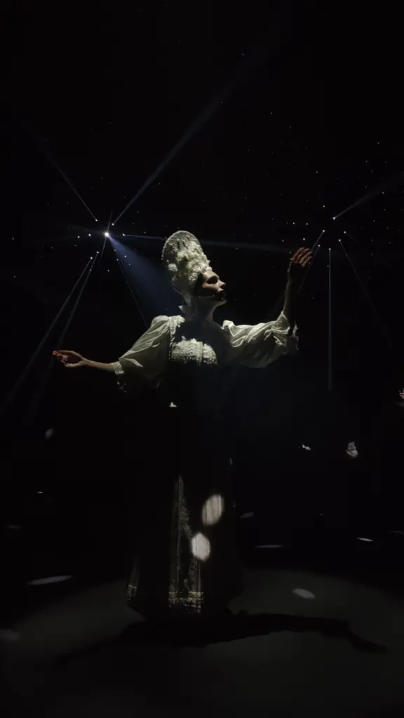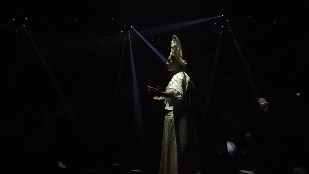 プラネタリウムのように半円形のドーム型の天井に星が散りばめられている暗闇の中で座って待っていると音楽が始まり、女性が歌い始める。歌は、ハンガリーの民謡で「avaszi szél vizet áraszt(春の風が水を氾濫させる)」。歌詞を繰り返しているように聞こえるが、なぜか聞き入ってしまう音楽だった。歌に合わせてパフォーマーの女性が動いたり、上からのサーチライトで照らし出されたりして音楽と調和し、自然と心に響く。