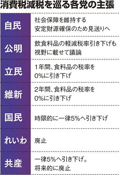 「食料品の消費税ゼロ」で税収は年間約5兆円減るのに比べ、玉木氏の一律5%の場合は約14兆円減る。その財源について玉木氏は「堂々と赤字国債で」と明快。「消費税廃止」を唱える共産党とれいわ新選組も一律5%案に同調する構えだ。