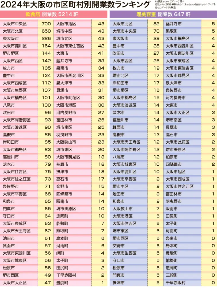 大阪・関西万博を契機に、〝商売の街〟大阪で新規開業が相次いでいる。データDXサービスなどを行うReview(大阪市中央区)の調査によると、2024年の府内の新規開業は飲食店が5214軒、理美容室が647軒に上り、計5800件を超えた。