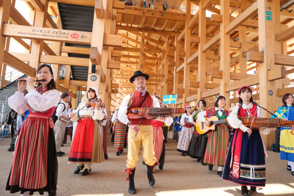 パレードではスウェーデンの伝統衣装を身にまとったパフォーマーを含む約80人のボランティア参加者が、音楽の生演奏に合わせて北欧パビリオン周辺を練り歩いた。