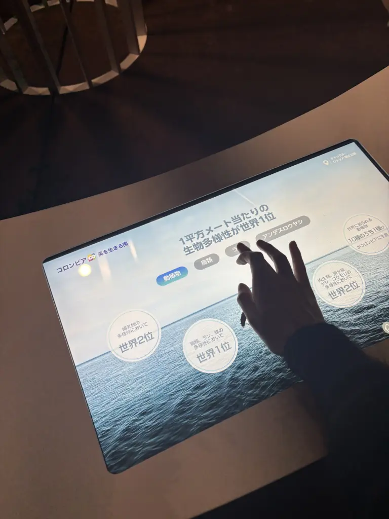 館内では、水をテーマにした映像を通して実際に海の中にいるような没入感を感じたり、コロンビアのあらゆる資源に実際に触れることで自然の豊かさを体感できたり、タッチパネルで同国の文化や観光、環境保護の取り組みについて学べたりできる。