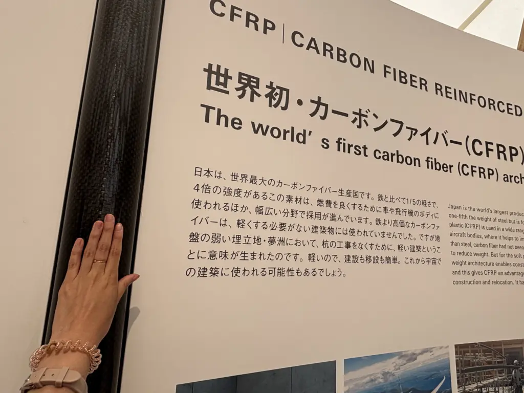 ドームBは、世界初のカーボンファイバーによる建築だ。この素材は軽くて強度があるのが特長だが、逆にいえば軽くする必要がない建築物に使われることは今までなかった。今回、地盤が弱いという土地の特性と、また移設を行う前提の建築物であることから、初めてカーボンファイバーで建築を行うことになった。今後は宇宙空間など、あらゆるシーンでの展開が見込める。