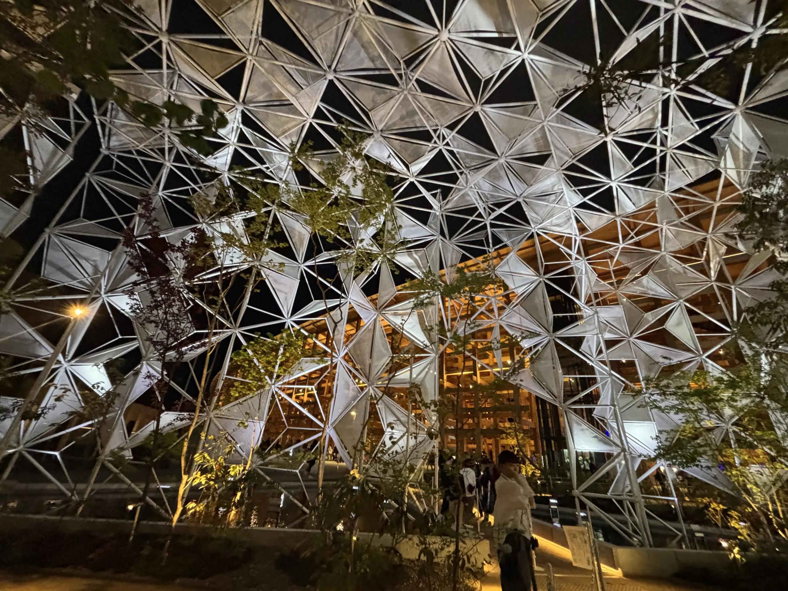 外観が印象的な同館のファサードは、2020年ドバイ万博・日本館で使用したものを再利用。建築家の永山祐子氏が考案した組子ファサードだ。見た目が涼しげで、ドバイ万博の際も話題を呼んだという。