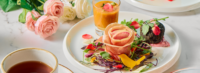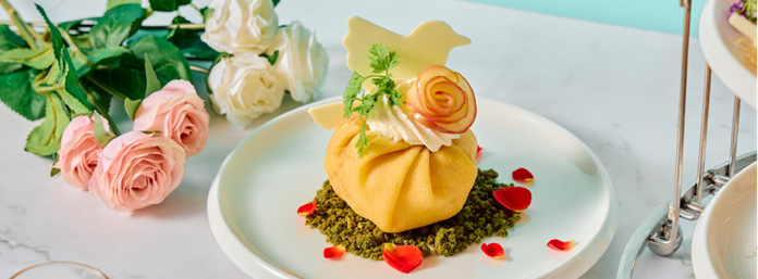 その名も「ことりローズガーデン」。なんとも優雅で気品溢れるネーミングの由来は、同ホテルがバラの名所として知られる中之島公園と靱公園に中間に位置し、時期的に見頃を迎えるバラ園巡りを楽しんでもらいたいという思いから、考案。昨年から期間限定で提供されている人気のアフヌンだ。