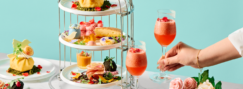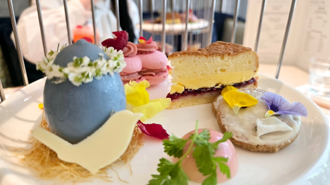 今年は、アクアブルーやピンク、イエローなどパステルカラーを基調に心踊る見た目に仕上げ、鳥かごをイメージした3段スタンドにスイーツ6品、セイボリー3品。さらに2種のジャムを添えたスコーンプレートと特製モクテルがセットになって6,000円(税・サ込み、数量限定)。