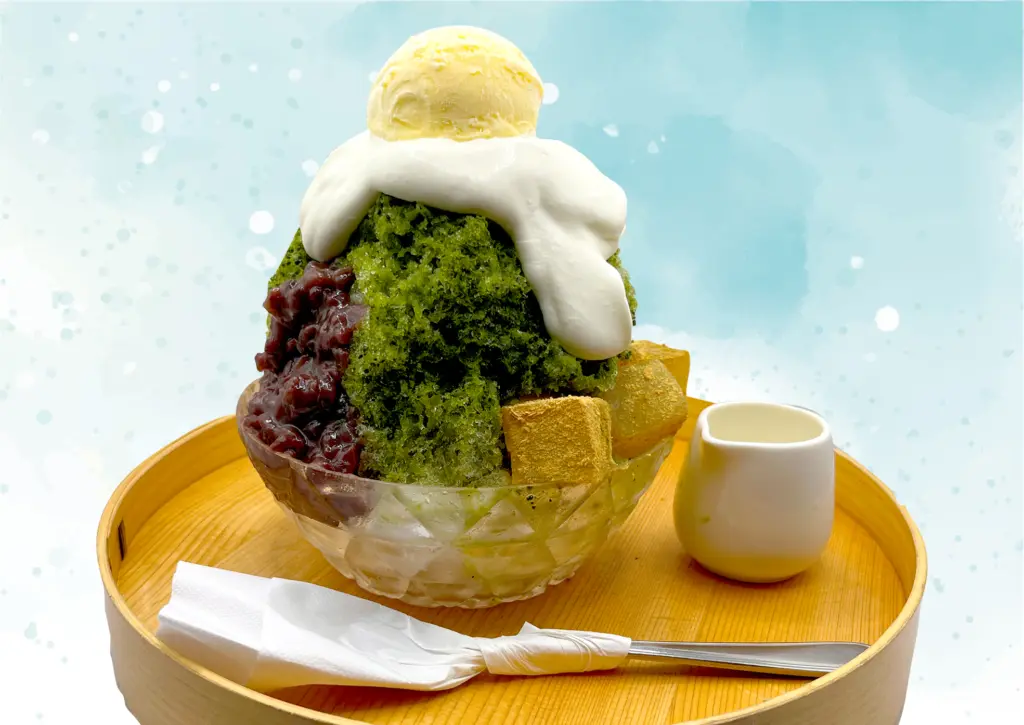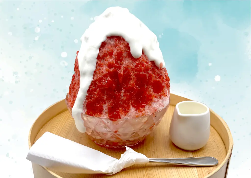 このかき氷の特徴は、透き通った溶けにくい純氷を丁寧に削り、氷に旬のフルーツやフレッシュな果肉フルーツソースを使用することで、旬のフルーツのおいしさを最大限に生かしている。