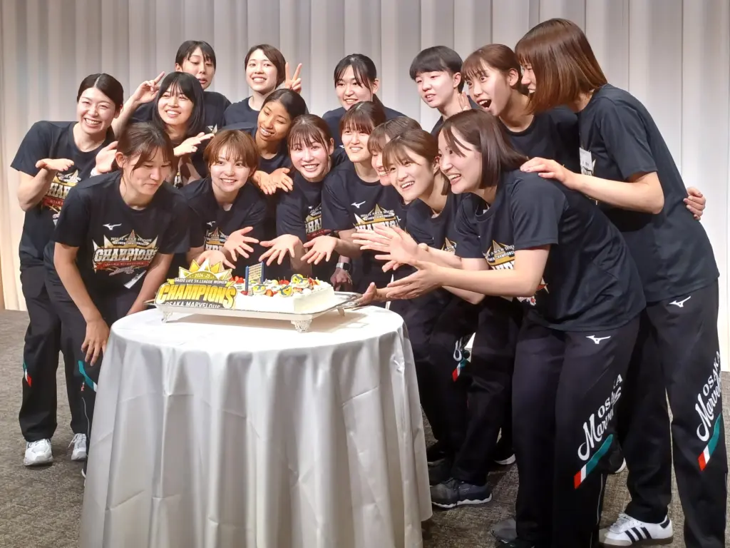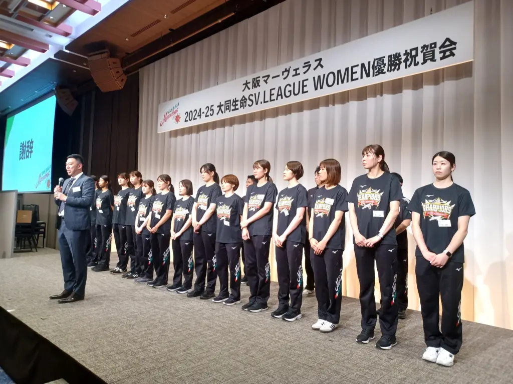 バレーボールの「2024-25大同生命SV.LEAGUE WOMEN」で優勝を果たし、リーグ初代女王の座を射止めた大阪マーヴェラスが28日、大阪ステーションホテル(大阪市北区梅田3-2-2)で優勝祝賀会を開いた。