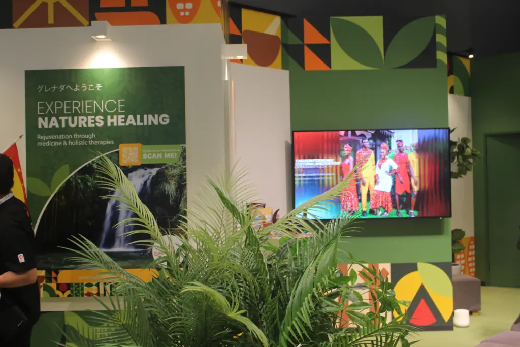 コモンズ館Aに出展している中米カリブ海の東端に浮かぶグレナダ。他の中南米諸国のパビリオン同様に、青い海と濃い緑が際立つビューティフルな自然が特徴の国で、展示内容も同じく、パネルと映像を使った紹介形式だ。