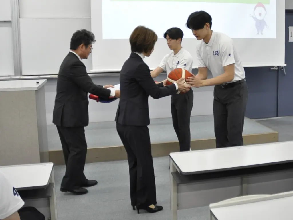 式典では、清水会グループから同大学バスケットボール部へ、バスケットボールやウォータージャグ、トレーナーバッグ、横断幕などの贈呈が行われた。これらは選手のコンディショニング強化やチーム設備の充実に活用される予定。