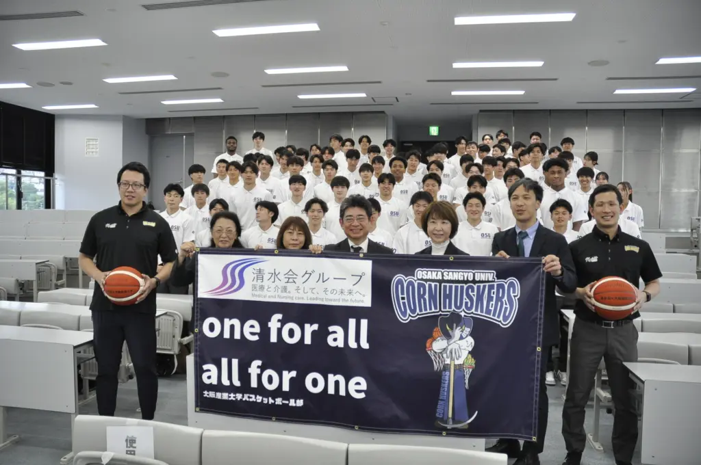 医療・福祉を中心に地域医療を展開する「清水会グループ」(守口市、水野智志理事長)は、大阪産業大学男子バスケットボール部(大東市、露口亮太監督)と5月31日、同大学キャンパスでスポーツを通じた学生支援と地域貢献を目的とするスポンサー契約の締結式を行った。