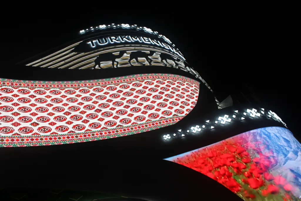 個性的な外観のトルクメニスタンパビリオン。国馬と国犬は、パビリオンに設置された巨大スクリーンでも、パビリオン内の紹介でもとても目立つ存在だ。
