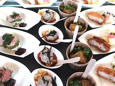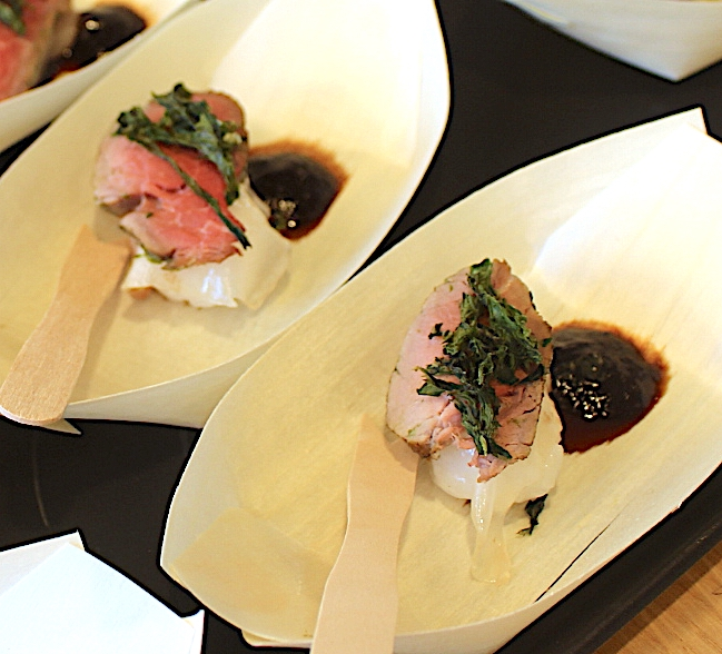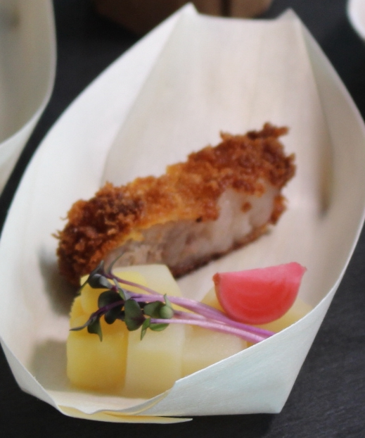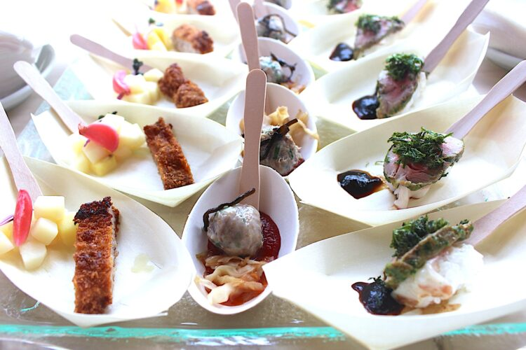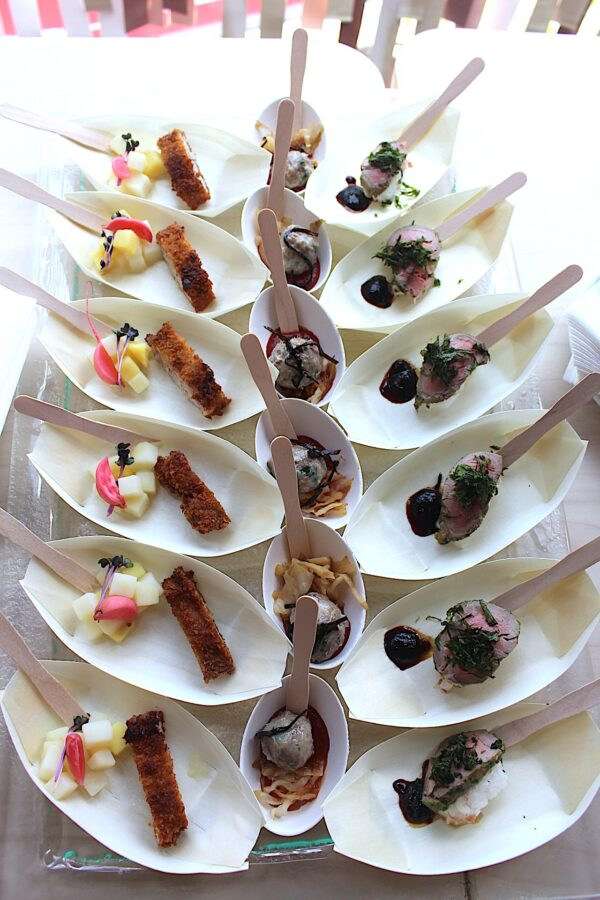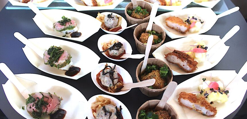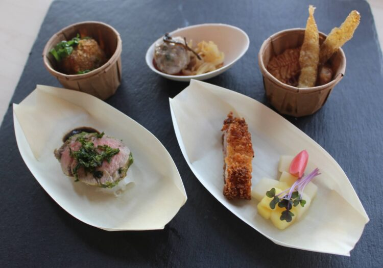 ハンガリーの農業大臣ナジ・イシュトヴァーン氏のスピーチの後、マンガリッツァ豚を使った一口サイズの料理が5種類振舞われた。独特の肉質と豊かな風味から、「豚肉の和牛」とも称されるハンガリーの在来種だ。