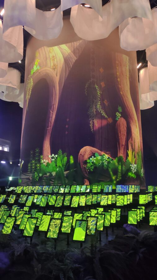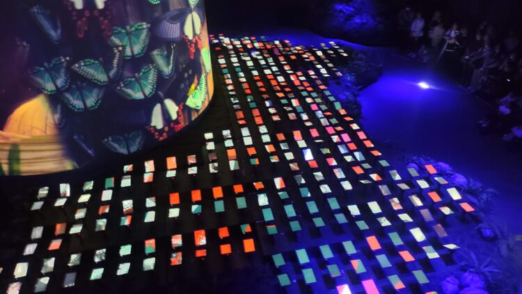映像が終わると、2階まで歩いて緩やかなスロープを下っていくが、途中で、世界生産量の3分の1を生産する胡蝶蘭や、AIを使って描かれたデジタルアートなどが鑑賞できる。