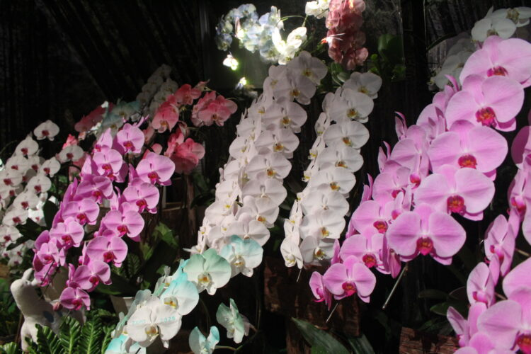 たくさんの胡蝶蘭が並ぶ「蘭の道」では、色とりどりの胡蝶蘭があるだけでなく、マイクロLED技術を使って、3Dで描かれた蝶が花の間を飛び交っている様子を見ることができる。