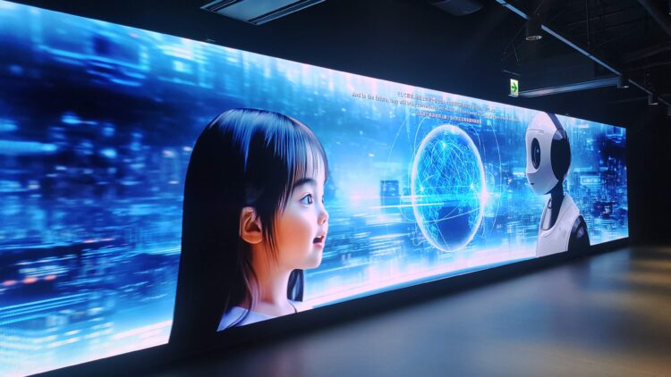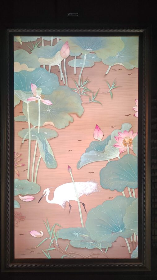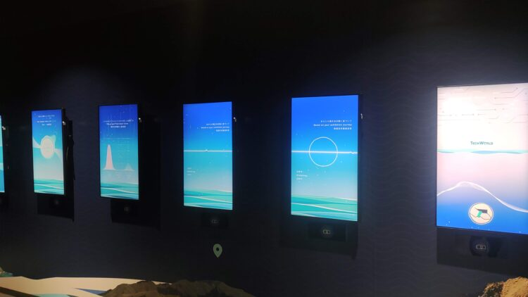 縦長の8Kモニターが並ぶ「AIギャラリー」では、台湾の有名画家たちが描いたアート作品を元にAIがデジタル化して描いた作品とインタラクティブな時間を過ごせる。