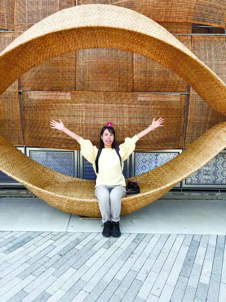 手織りのベンチがパビリオンの外壁にくっついている。カップルフォトにも◎