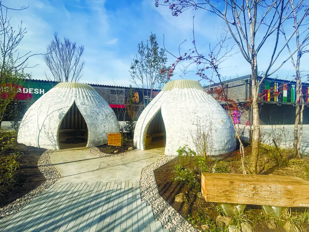 3Dプリンターで作られた休憩所「森になる建築」。植物由来の生分解性樹脂を3Dプリントしてつくった建築に、種入りの紙を貼っており、時間が経つにつれて植物が育つそう。使用後は時間をかけて土に還るという、最先端でSDGsな休憩所だ。