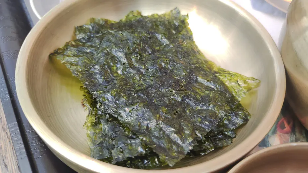 定食に含まれているキムチ、韓国のり、塩辛はおかわり自由。キムチは浅漬けで、塩辛とともに辛さはマイルド。韓国のりはごま油の匂いが香ばしい。これだけで食事が進む。