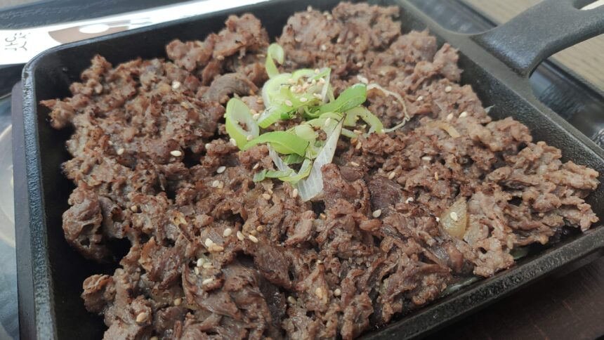 特徴は、主にロースやネック部位を使用し、肉を薄く叩いて広げ、鉄板で均一に焼き上げるスタイル。タレは醤油をベースに、梨やリンゴ、玉ねぎなど果物の自然な甘みを活かしたあっさり味で、炭火ではなく鉄板で焼くのが一般的なので、ここでも熱々の鉄板に乗って提供された。